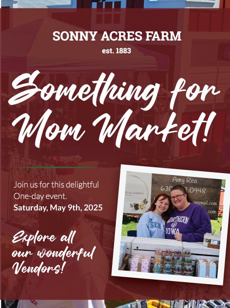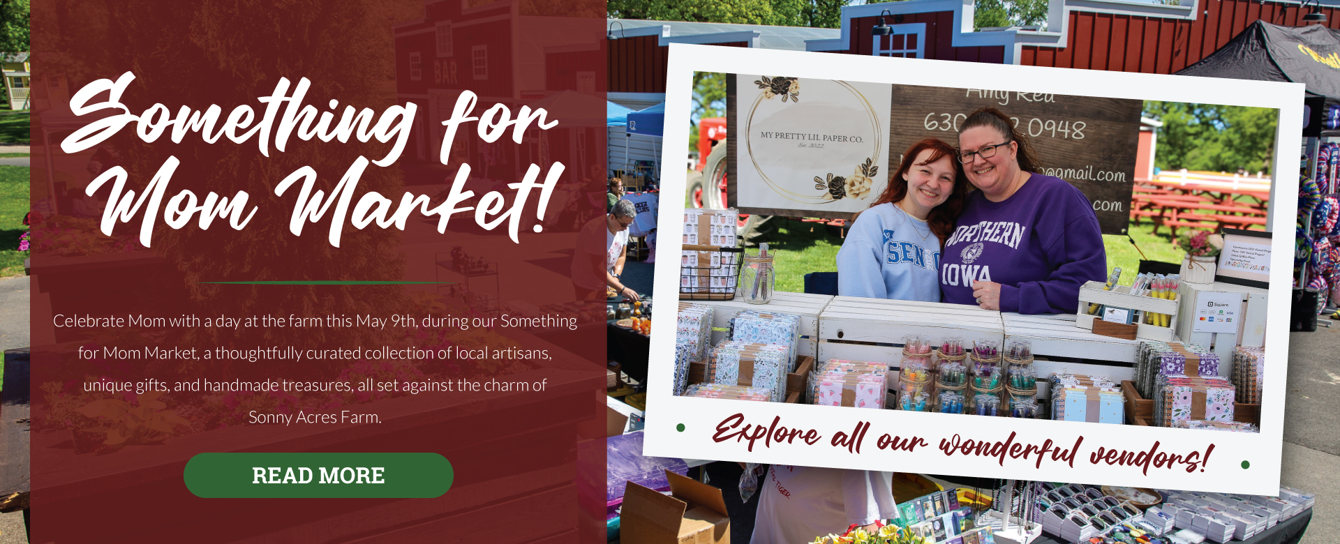 Celebrate Mom with a day at the farm this May 9th, during our Something for Mom Market, a thoughtfully curated collection of local artisans, unique gifts, and handmade treasures, all set against the charm of Sonny Acres Farm. READ MORE